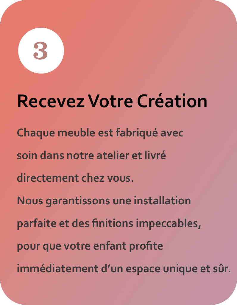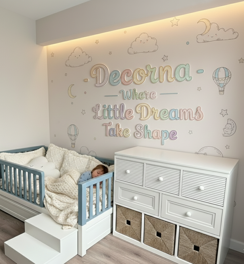 Chaque meuble DECORNA est fabriqué à la main dans notre atelier de Casablanca. Nous utilisons uniquement des matériaux de qualité supérieure et des techniques traditionnelles pour créer des pièces durables, élégantes et sûres pour vos enfants